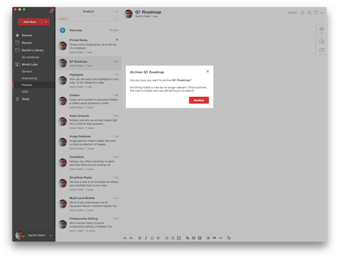 Notejoy offers the perfect solution: you can archive notes, notebooks, and libraries to mark them as no longer relevant, hide them from browsing, but keep them searchable when needed.