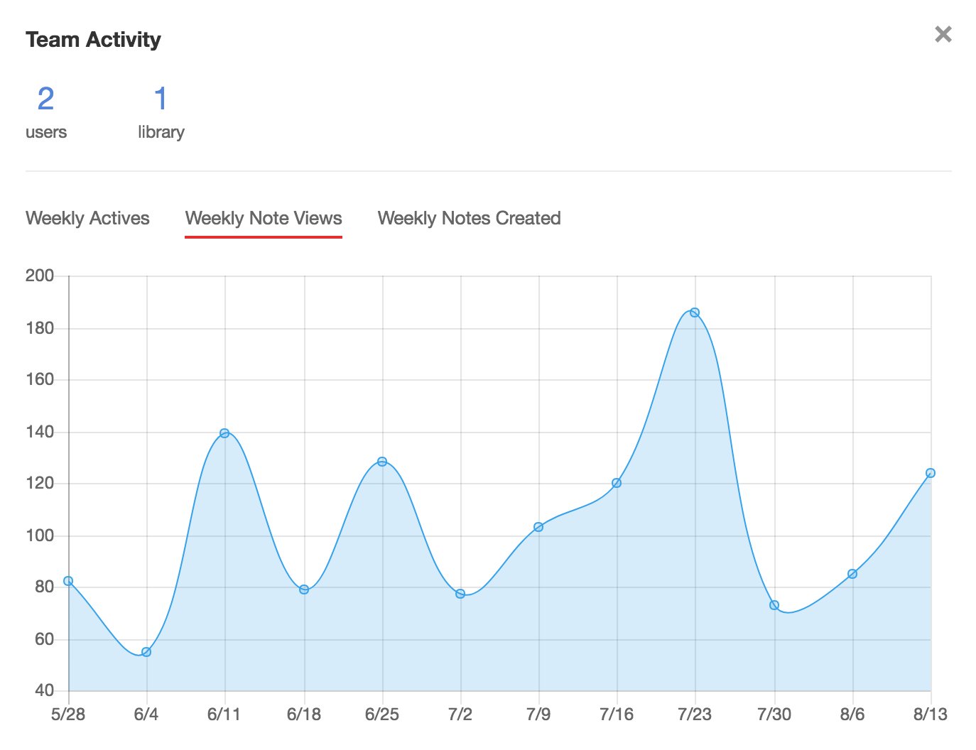 Notejoy gives organization admins the ability to easily monitor usage across their users & libraries. You can easily see weekly actives, weekly note views, and weekly notes created for the past 3 months.