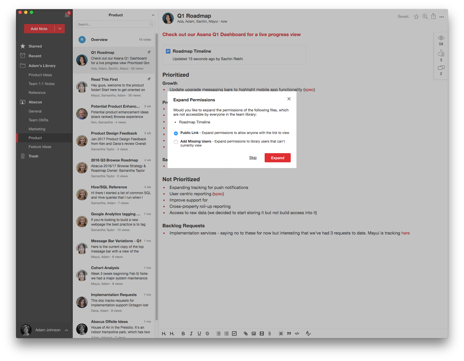 Notejoy automatically offers to expand file permissions when we notice you've attached a document that not everyone in the team library can see.
