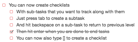 Checklists also support sub-tasks. Just press tab on a task and it'll automatically be indented. We support any number of levels of sub-tasks. Then just hit backspace to go back to the previous level. Or enter to end a checklist.